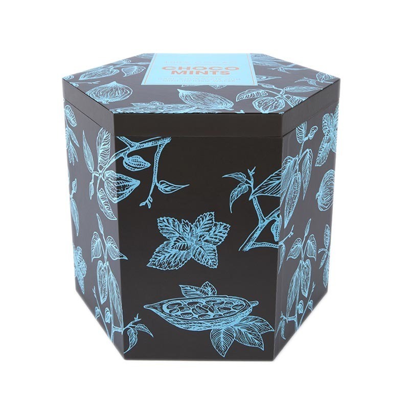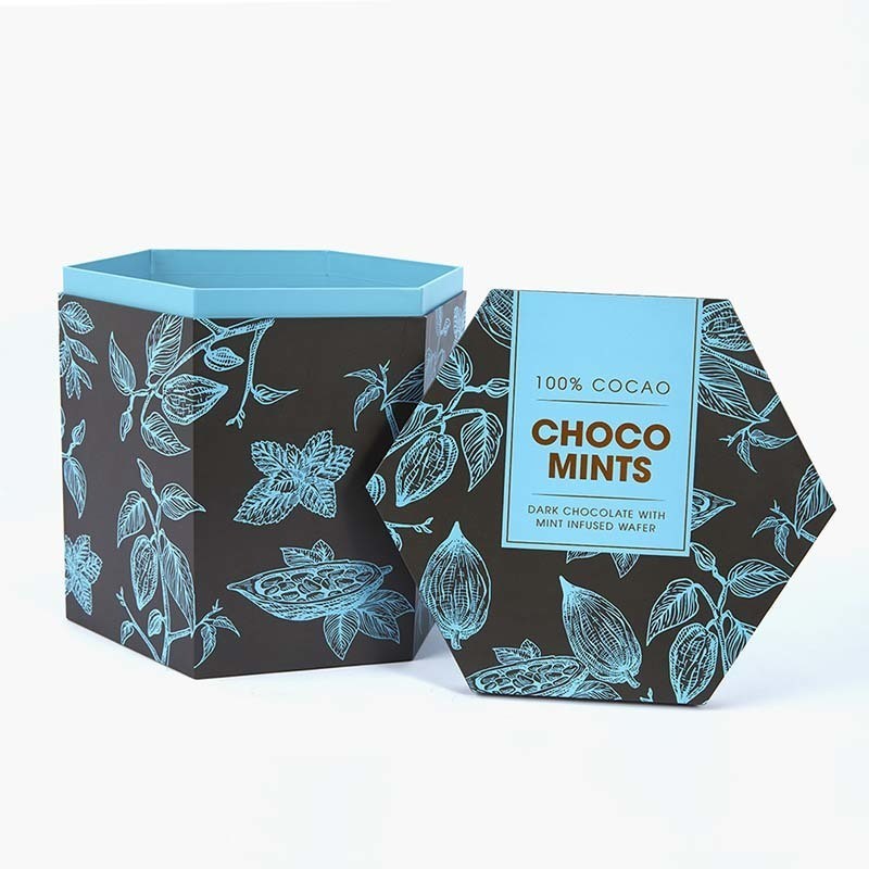Functional hexagon shape tall lid & base food packaging with tear lines. Perfect for chocolate, birthday, wedding, clothing, Christmas, party, and candy gift packaging.