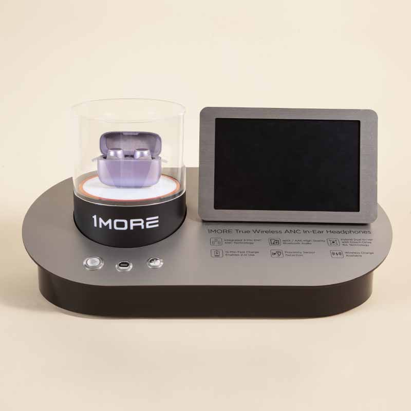 This clear acrylic display stand is designed for showcasing in-ear headphones and earbuds with built-in LED charging functionality, perfect for retail counters and product displays.